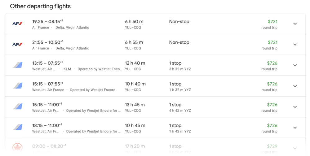 If these options aren’t what you’re looking for, you can expand the list to see the full range of options (for example, in case you’re looking for an itinerary with a longer layover somewhere in the middle, with a greater distance travelled for mileage-earning purposes, etc.)