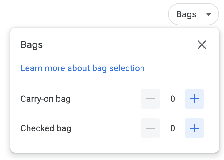 The Bags filter helps you compare the all-in pricing for your flights based on how many bags you need to bring. These days, many North American airlines levy additional bag fees for travel within Canada and the US, so the Checked Bag selector allows Google Flights to add the checked baggage fee to the search results and show you the all-in pricing.