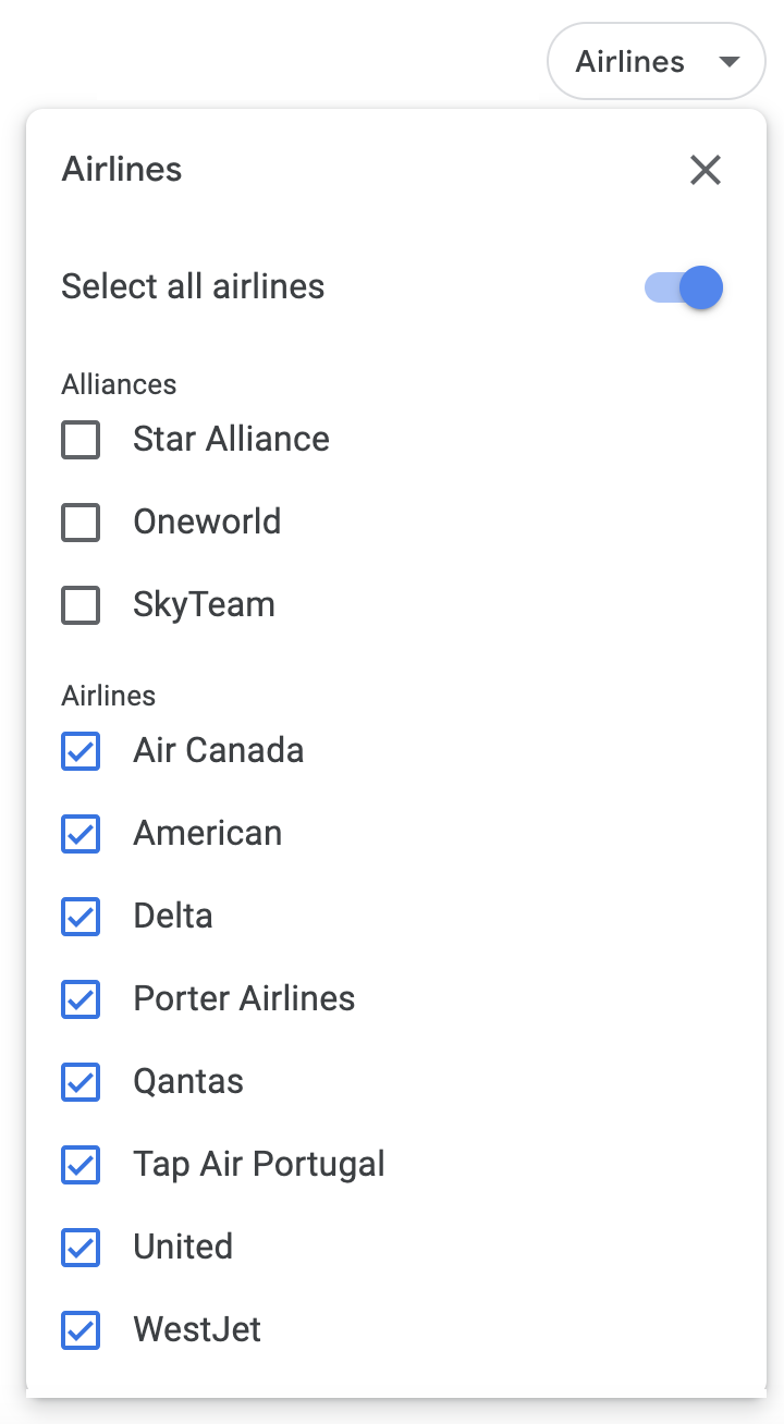 You may also filter by the major airline alliances: Star Alliance, Oneworld, and SkyTeam. Unlike FlightConnections, where the Alliances and Airlines filters are separate, Google Flights combines them into one; this will again prove useful when researching award trips.