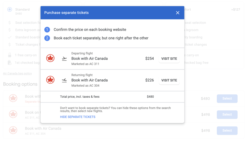 That last one is very interesting: if you’re booking a round-trip or multi-city trip, Google Flights is smart enough to check whether it would be cheaper to book everything as separate one-way flights rather than as a single ticket.