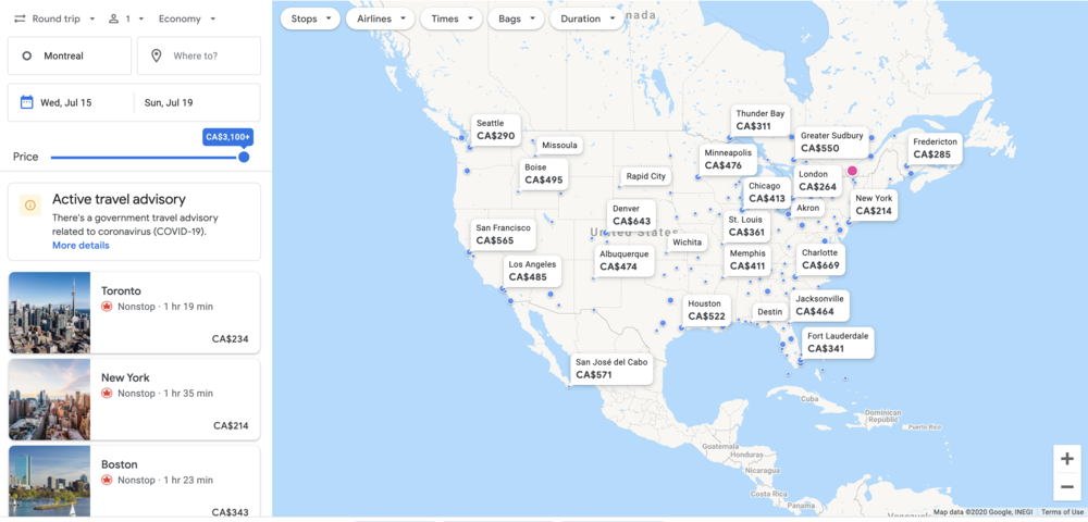 You may also use the selectors for booking type, number of passengers, and class of service, the Price slider, as well as the filters for Stops, Airlines, Times, Bags, and Duration, to narrow down your search terms further. The Explore map will adjust accordingly based on your specifications.