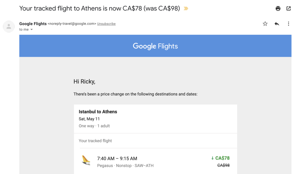 Finally, if you aren’t quite ready to book something just yet, you can sign in to Google Flights using your Google account and track the price of a specific itinerary. You can also sign up for email notifications when the price increases or decreases significantly, which allows you to keep track of your expected costs for any upcoming trips you’re planning.