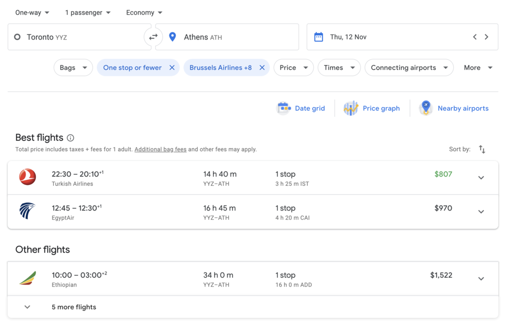 For example, if dynamic pricing on Air Canada flights on Aeroplan is sky-high, you can combine a “One stop or fewer” filter with a “Star Alliance excluding Air Canada” filter to identify several possible one-stop routings with partner airlines.