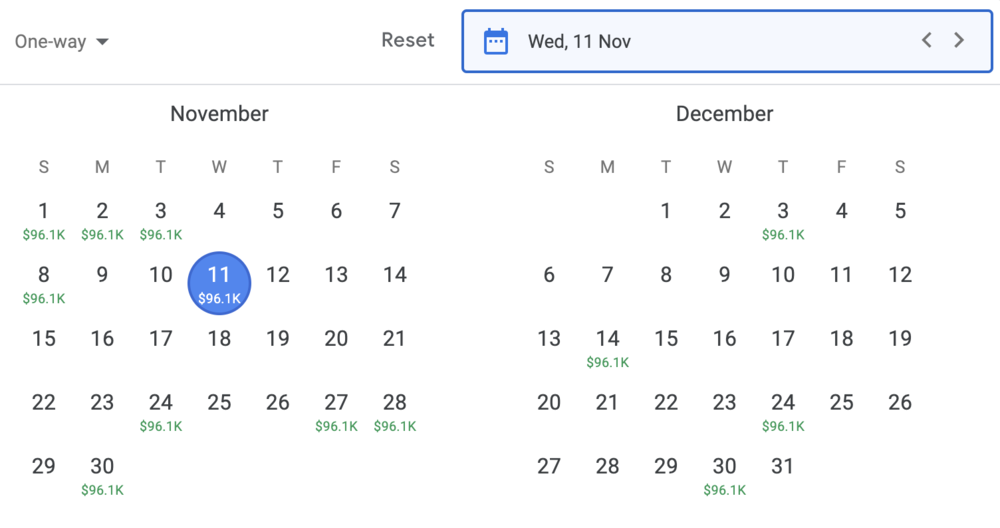 Best of all, you can combine all the filters we discussed previously with the calendar view as well. Upon selecting your filters, clicking on the Date selector will show you the cheapest dates with your filters being applied.