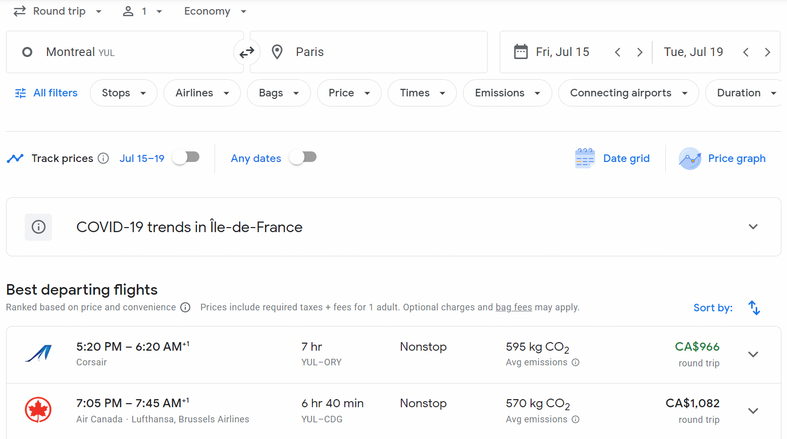 Once you click “Search”, you’re presented with a list of possible flights. Google Flights first displays what it has identified as the best flights, taking everything into account: price, convenience, trip duration, departure and arrival times, etc.