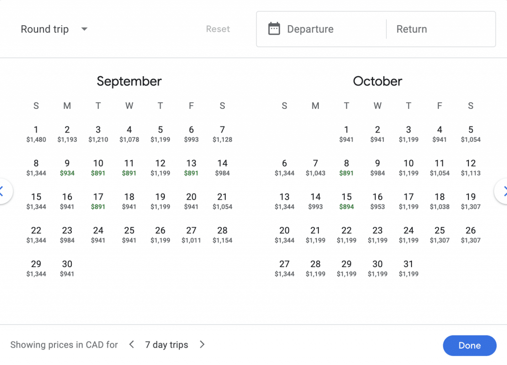 For a round-trip, you can use the trip duration selector at the bottom of the calendar to specify how many days are spanned by your departure and return. Here’s an example for a seven-day Vancouver–Tokyo round-trip: