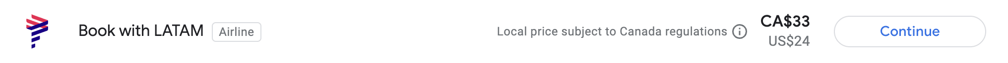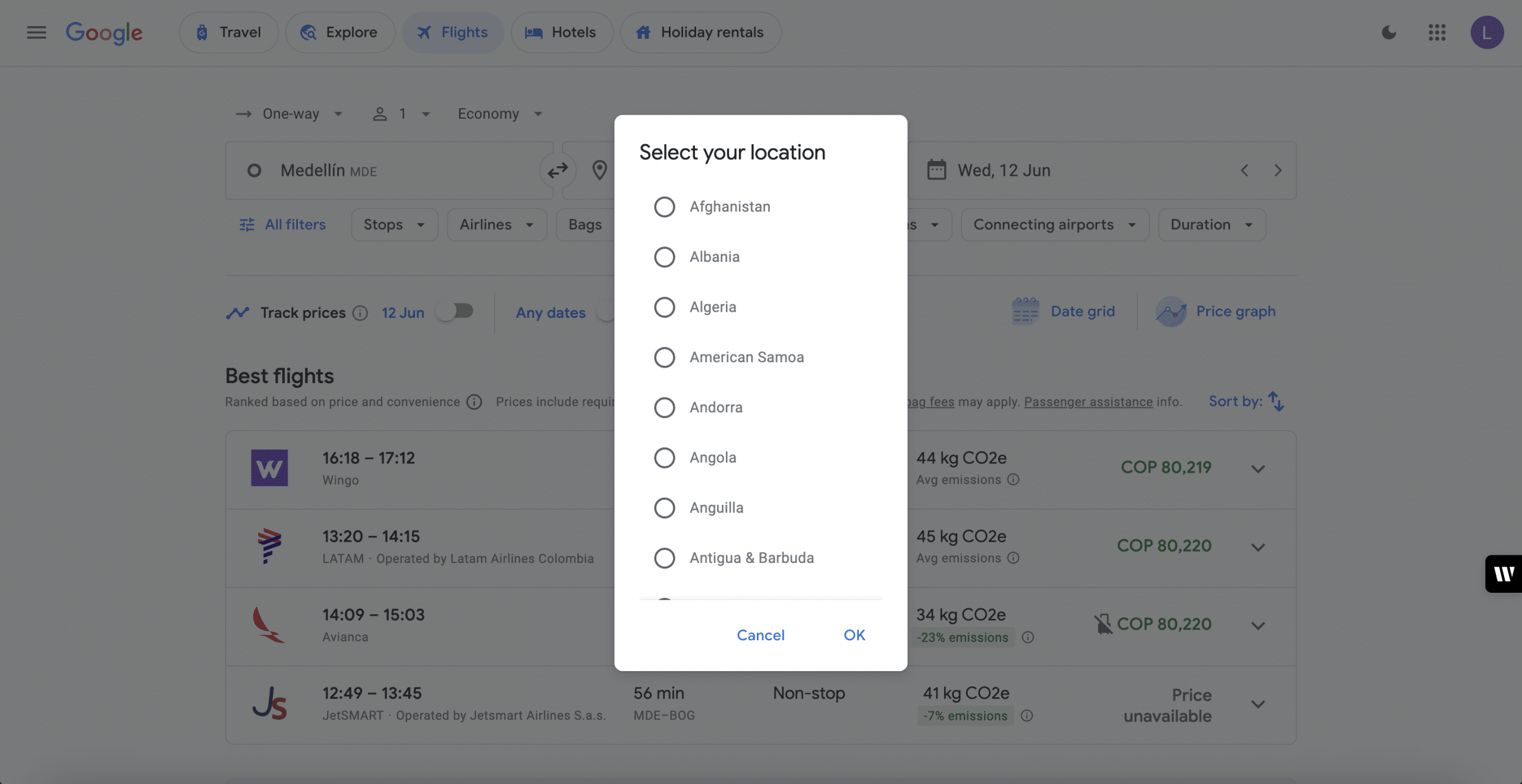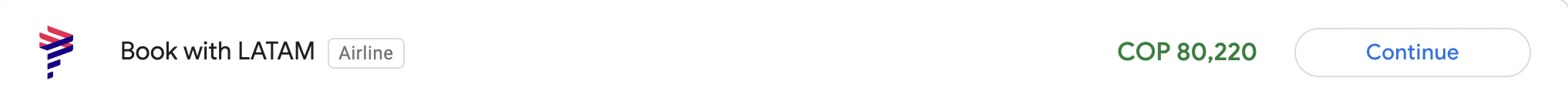 In the example above, which is a one-way flight from Medellin to Bogota, 80,220 COP is equivalent to $28.50 (CAD) or $21 (USD). By changing Google Flights’ location to Colombia, you’ll get to access LATAM’s Colombia website and the lower fare.