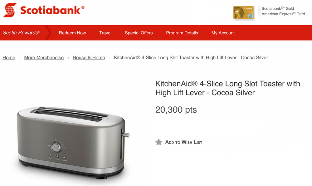 It’s pretty clear to see that the redemption structure for merchandise is set up unfavourably for the consumer. It’s not just CIBC either – most loyalty programs have something similar in place. Take Scotia Rewards’s offer of 20,300 points for a brand new KitchenSlice toaster: