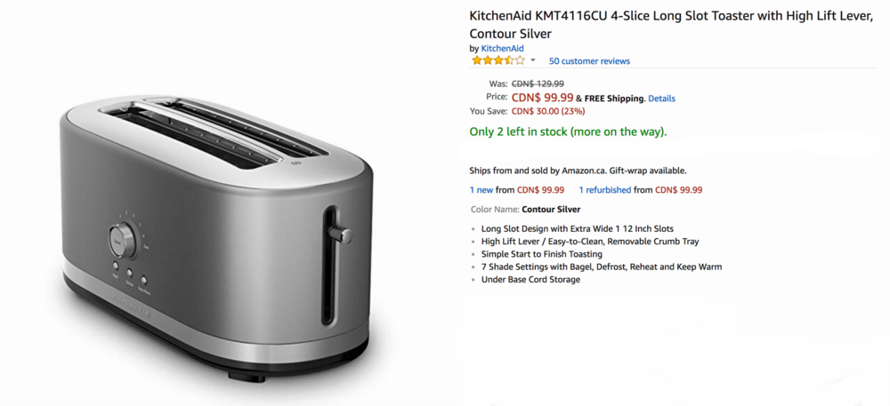 Of course, a quick look on Amazon shows us that $99.99 is the alternative cash price, so call it $113 after 13% sales tax. Since Scotia Rewards points can also be redeemed at 1cpp for travel purchases, we can therefore surmise that you wouldn’t be getting the toaster for free; instead, you’d be paying $203 – $113 = $90 more than you need to!