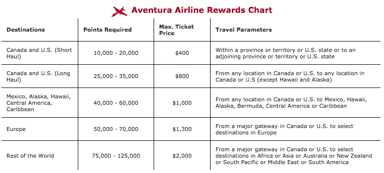 One is their in-house flight award chart, which works similar to RBC Avion in that you exchange a certain amount of points for a round-trip flight within a certain geographic region, up to a maximum ticket price: