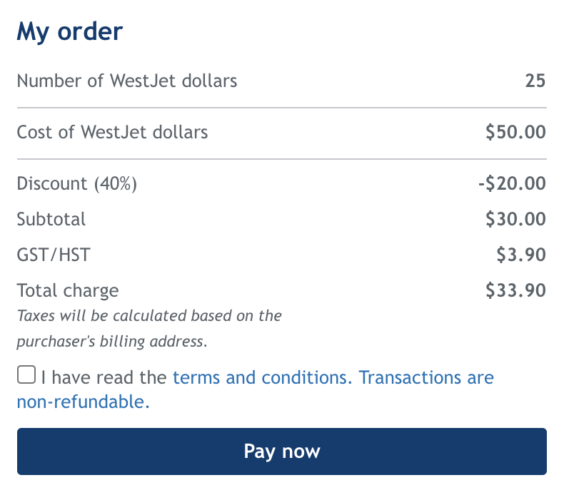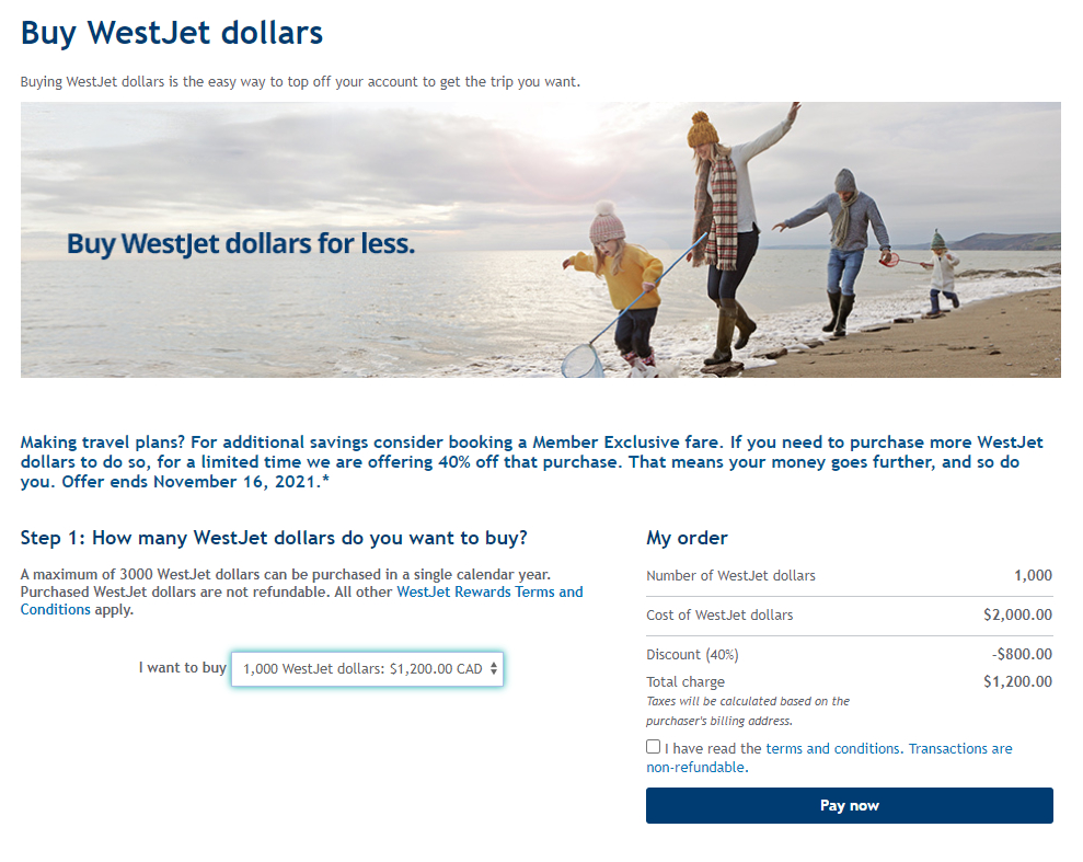 After clicking through on the link in the email, I quickly realized that WestJet had made the very bold move to charge $2.00 per WestJet Dollar before the discount. With a 40% discount until November 16, 2021, each WSD therefore costs $1.20.