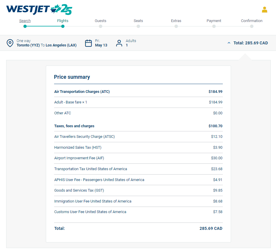 I’ve chosen a fare from Toronto (YYZ) to Los Angeles (LAX) on Friday, May 13, 2022.