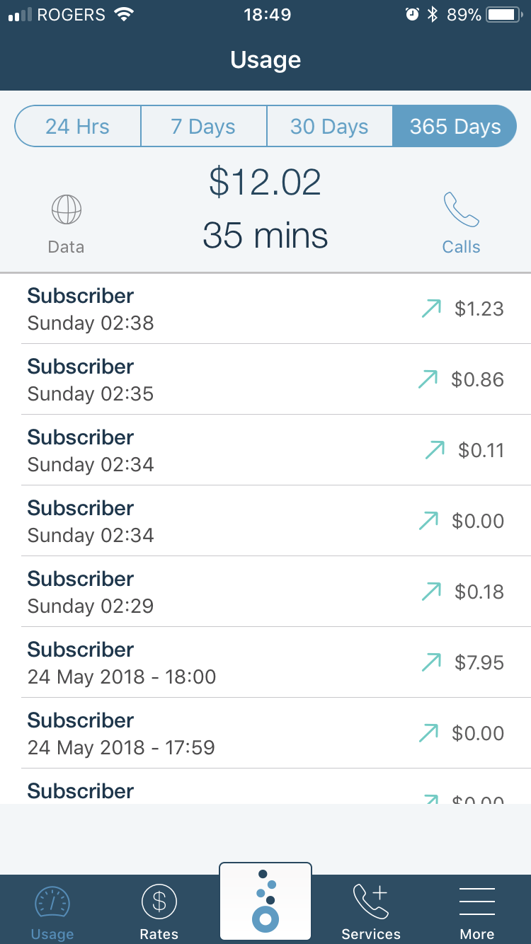 The ticket somehow hadn’t been issued correctly, so I had to call Aeroplan in order to prevent a potential “denied boarding” debacle. That’s the $7.95 phone call you see in the usage log below. KnowRoaming couldn’t have been more useful throughout all this, and I certainly resolved these issues with greater efficiency than if I had been worrying about the roaming charges I’d have to pay.