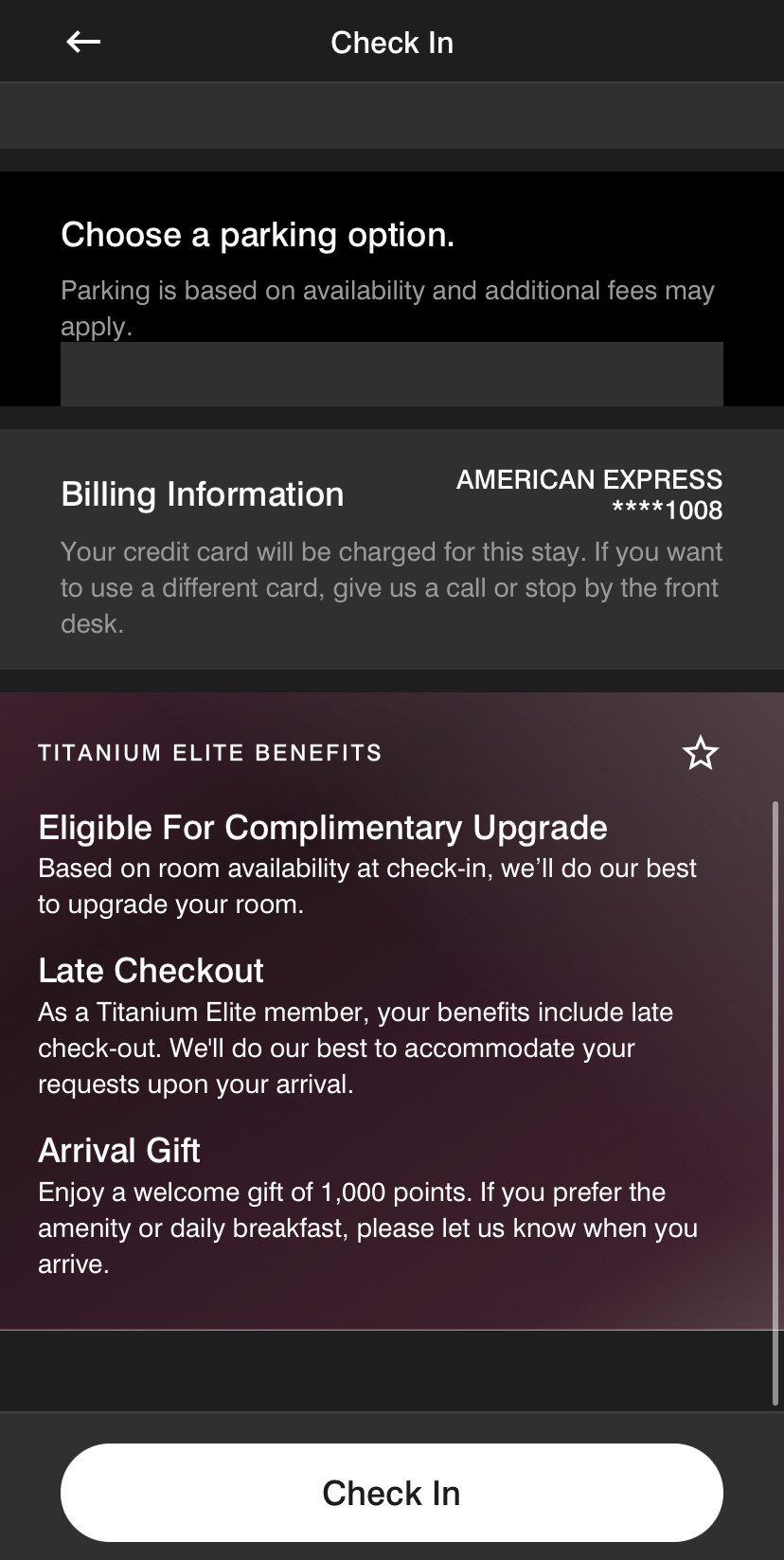 Wrong. In general, you’ll find that these guests never use mobile check-in, since that feature automatically selects a welcome amenity on your behalf: “Enjoy a welcome gift of 1,000 points. If you prefer the amenity or daily breakfast, please let us know when you arrive.”