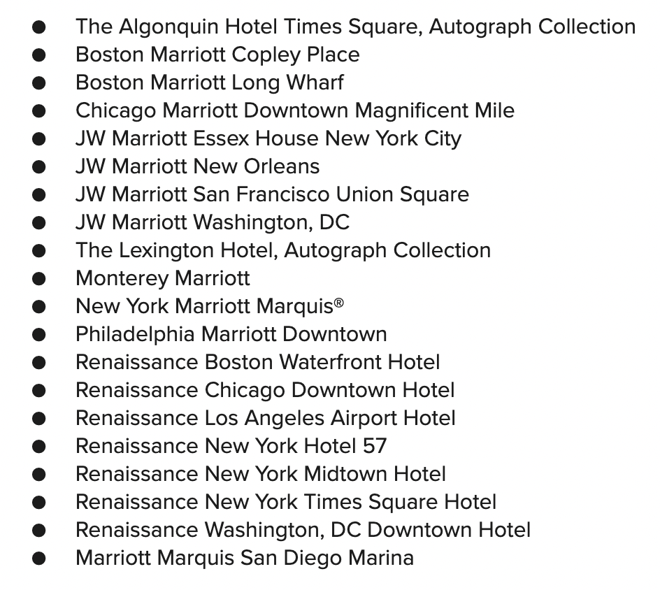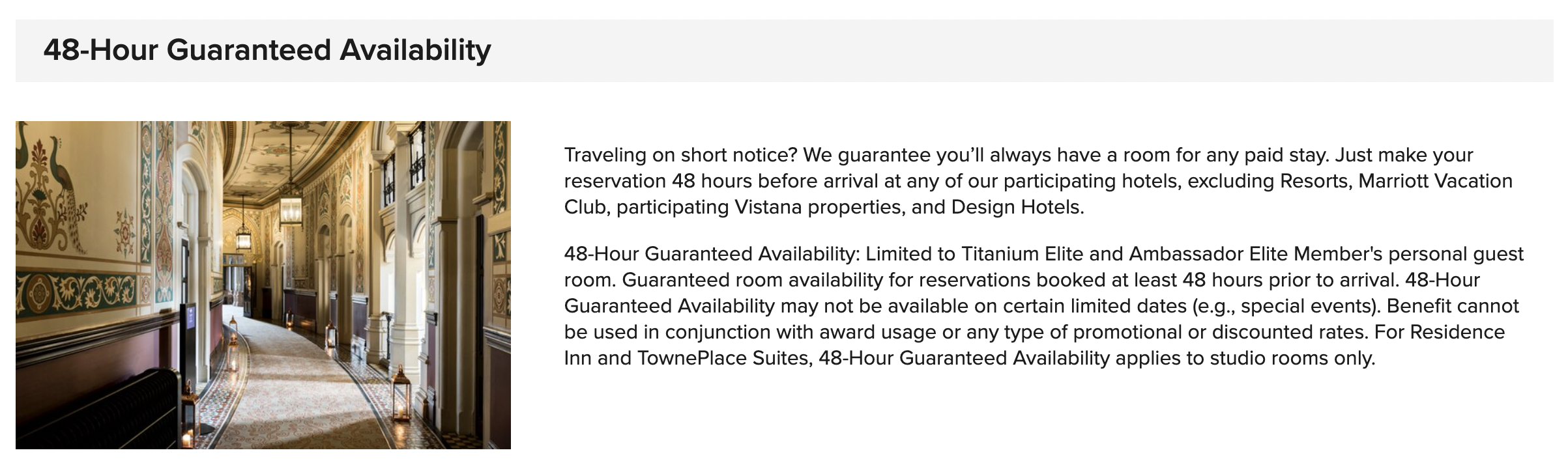 This benefit is applicable to Titanium and Ambassador members only, and just means that there will always be a room for you at any Marriott hotel in the world if you’re making a paid booking at least 48 hours before arrival. Resorts, Design Hotels, Marriott Vacation Club, and Vistana properties are excluded.