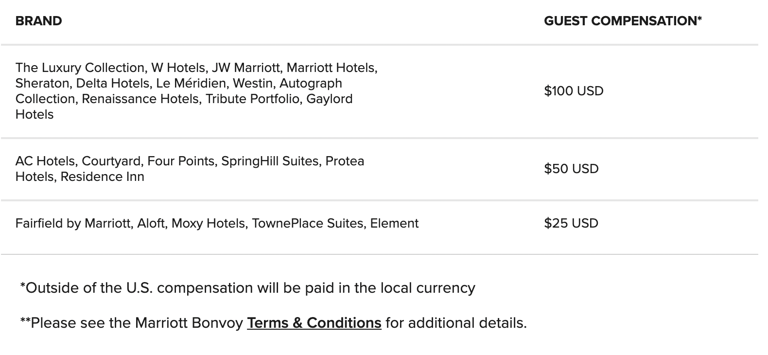 As you can see, at many full-service Marriott brands, a guest who gets “walked” would indeed walk away with a veritable windfall of US$200 and 90,000 Marriott Bonvoy points. At limited-service brands, guests would only get US$100 compensation, and only Platinum and Titanium members would receive 90,000 Bonvoy points on top.