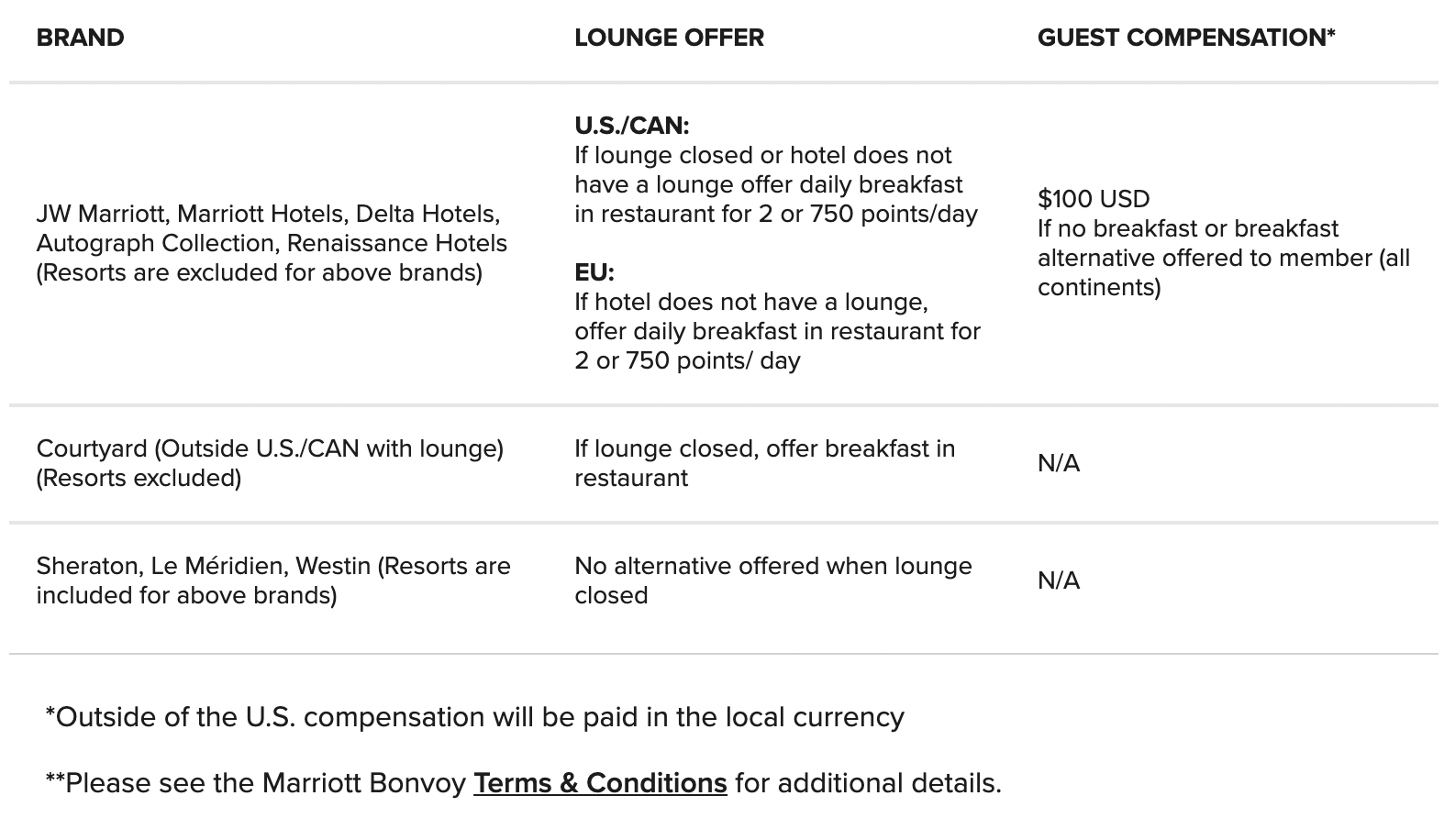 In terms of compensation, the only situation in which you’d be entitled to claim US$100 in cash would be if you’re staying at a JW Marriott, Marriott, Delta, Autograph Collection, or Renaissance property, the lounge is unavailable for some reason (it’s closed or the hotel doesn’t have one), and you aren’t offered a breakfast alternative upon check-in.