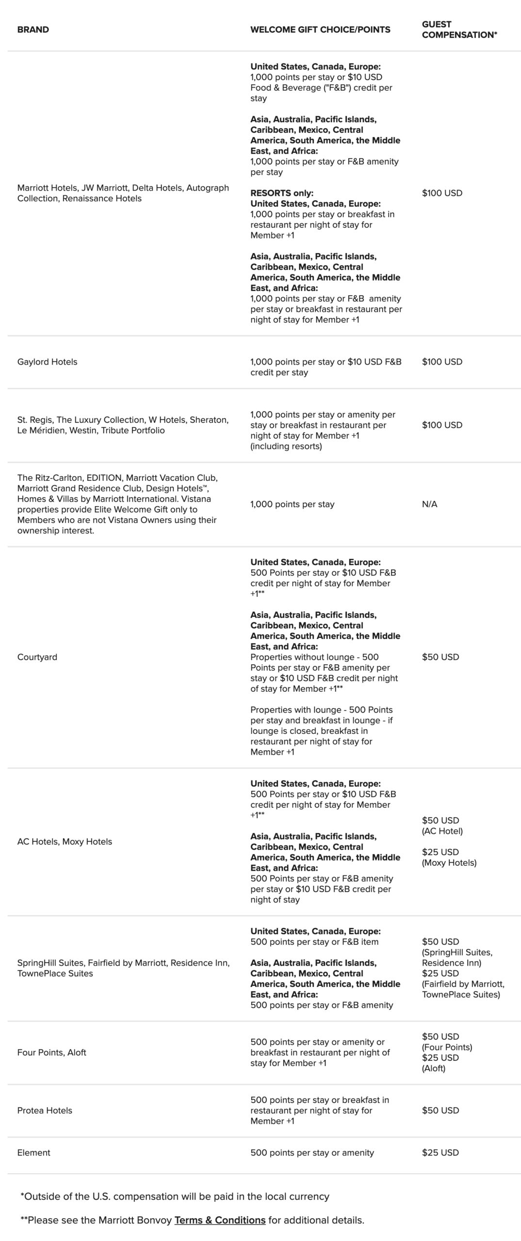 Even though the list is rather byzantine at first glance, you should be able to figure out exactly what choice of welcome gift you’re entitled to for every stay, as well as the guest compensation that’s due if you aren’t offered the welcome gift.