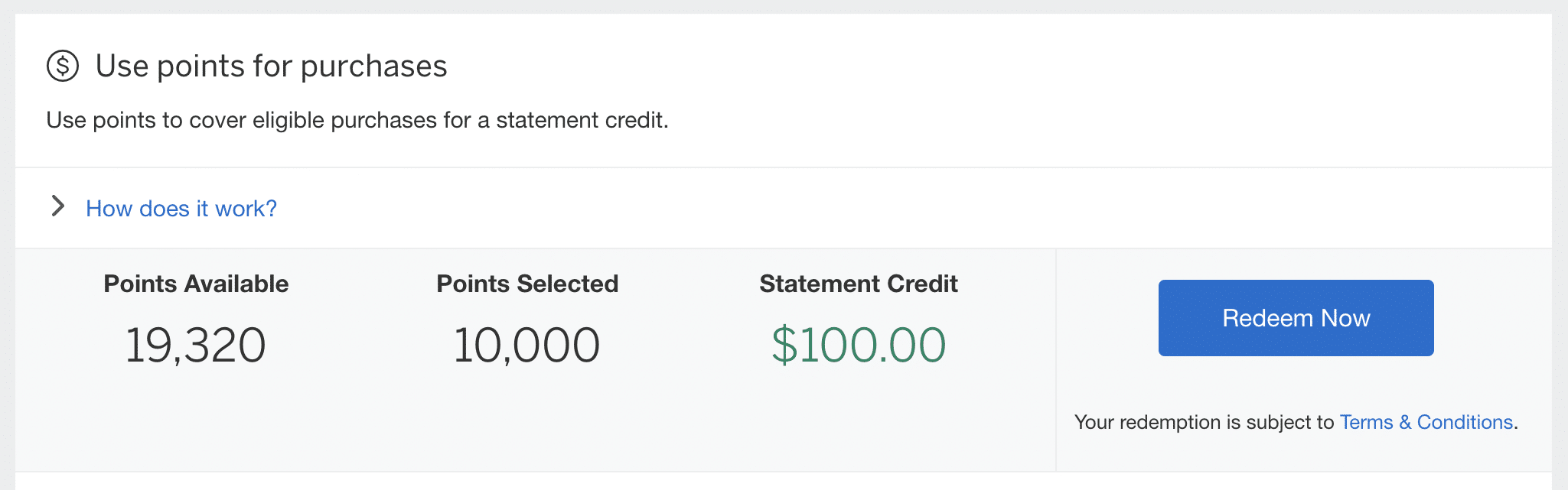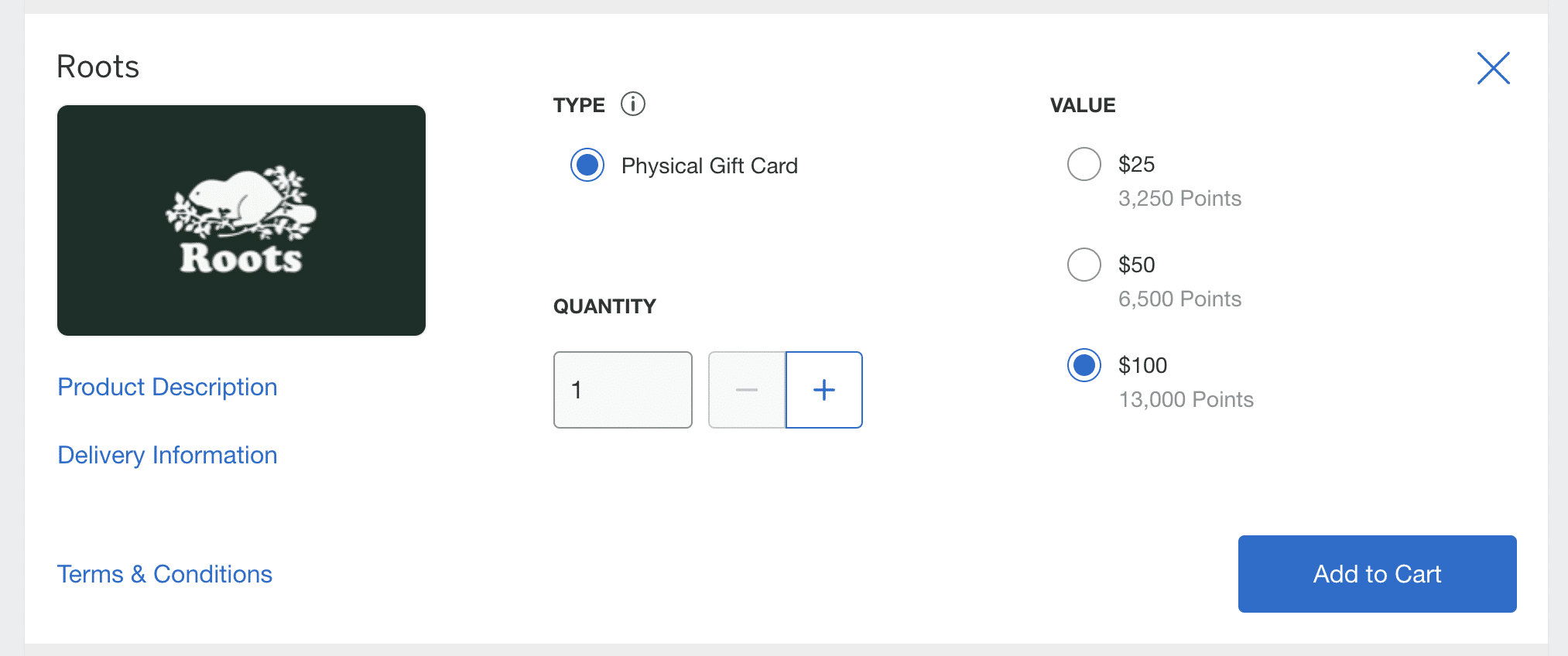 Alternatively, if you were to redeem your MR points for merchandise purchased directly through American Express, like for a $100 Roots gift card, it would cost 13,000 MR points. This works out to a value of 0.76 cents per point, which is less than what you would get when buying directly from the Roots store and redeeming for a statement credit, as shown in the first example.