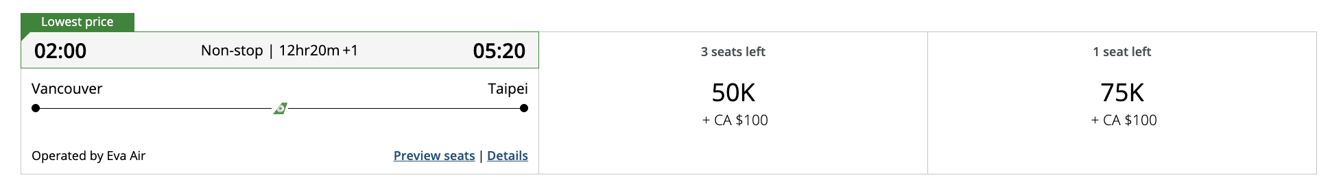 Booking through Air Canada Aeroplan, the same flight costs 6,000 Aeroplan points (or 6,000 MR points since MR points transfer to Aeroplan points at a rate of 1:1) plus $154 in taxes and fees. This means your 6,000 MR points essentially covers the $208 cash base fare, giving you a whopping value of 3.47 cents per point!