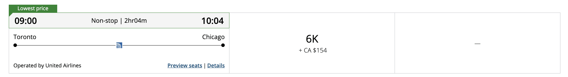 Now, let’s look at the value you could get by using these same points to make a travel redemption. Imagine you need to make a one-way flight award booking from Toronto to Chicago in economy. In cash, the price of the flight is $362, inclusive of $154 in taxes and fees.