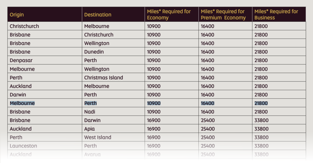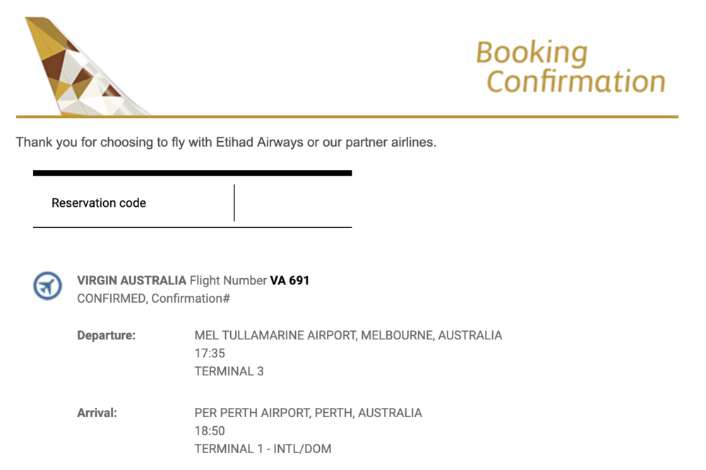 And so, among Virgin Australia’s partner airlines, Etihad Guest turned out to be the most feasible option. Etihad maintains distinct award charts for each of its partners, so I looked up the Virgin Australia partner chart to see how many miles I’d need, and Melbourne–Perth came in at 21,800 Etihad Guest miles one-way in business class.