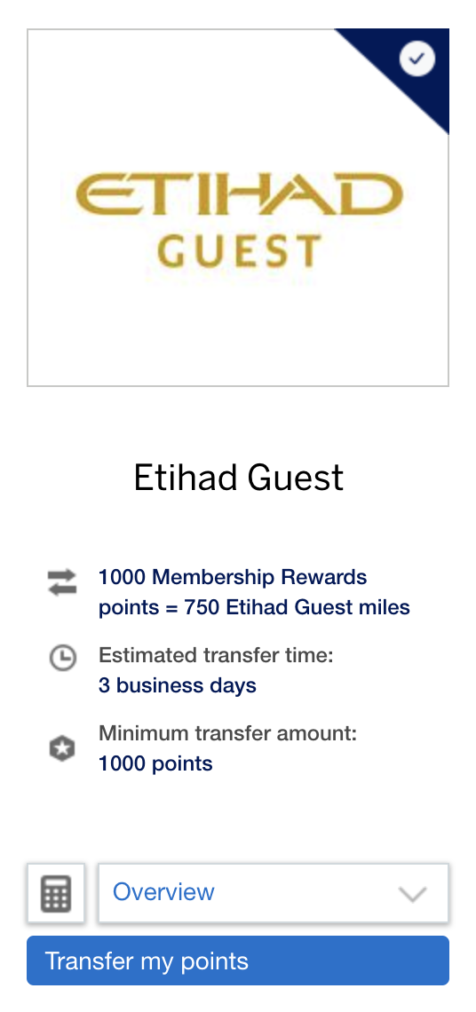 I already had 447 miles in my Etihad Guest account as a result of crediting some Oman Air flights I had taken earlier this year, so I now needed to add 21,800 – 447 = 21,353 more miles into my account. With a 1:0.75 transfer ratio, that meant I needed to send over 28,470 Amex MR points… except you must transfer in chunks of 1,000 MR points, so I ended up having to transfer 29,000 Amex MR points in the end.