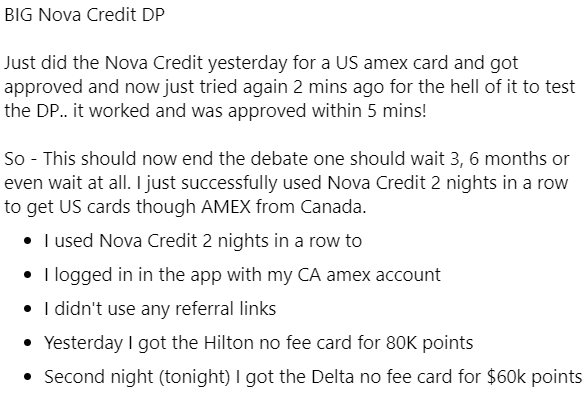 In fact, there are even confirmable data points of people getting approved for multiple American Express US cards through Nova Credit in a very short period of time, no ITIN needed, such as the following from the Prince of Travel Elites Facebook group: