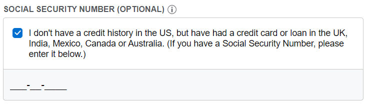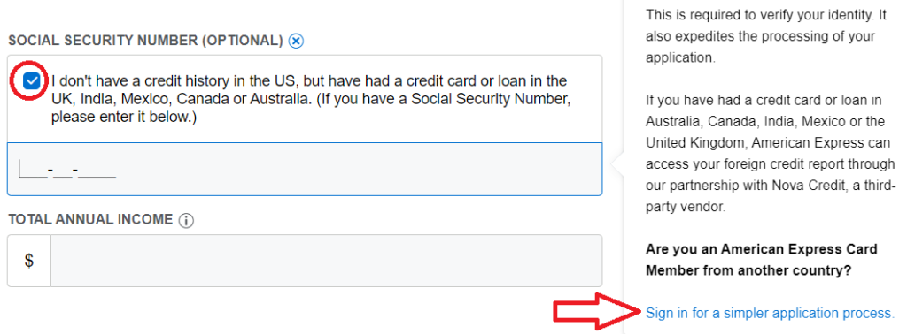 Simply apply normally and tick off the “I don’t have an SSN” box, but do not log-in. Once you hit Submit, you’ll be redirected to Nova Credit, who will generate a credit report for Amex US to say yay or nay to.