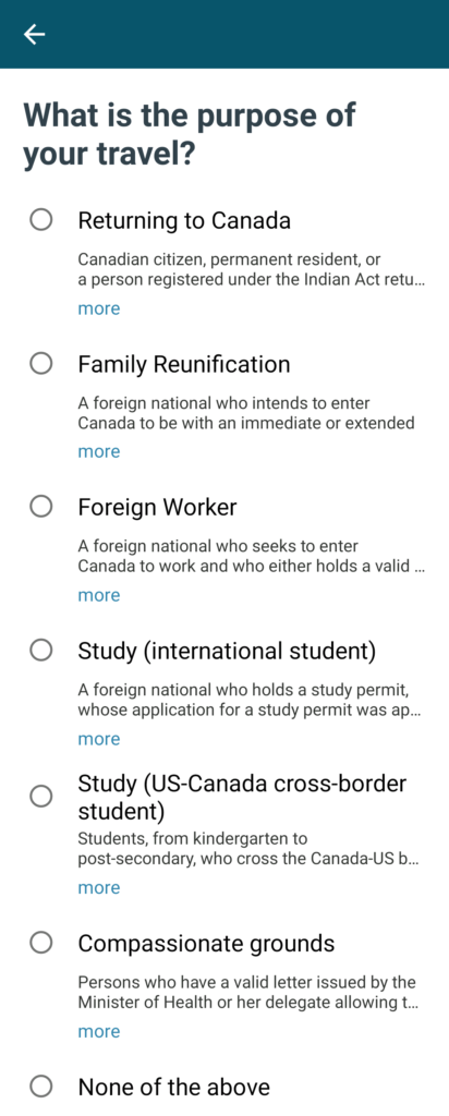The Government of Canada needs to understand the purpose of your re-entry into Canada. For most, the answer will be the first option, Returning to Canada.