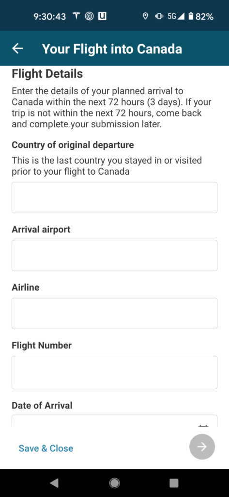 For the most part, I would expect most Prince of Travel readers to be re-entering Canada by air. In doing so, the Government of Canada requires you to enter your flight details.