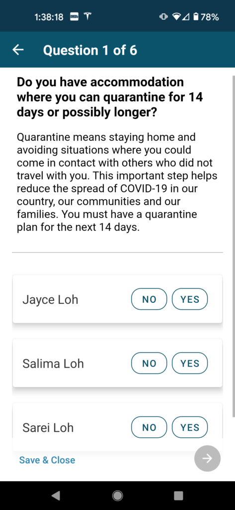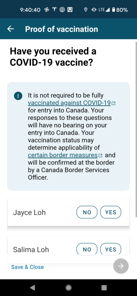 As you’ll see, the Government of Canada sure likes to use the ArriveCAN app to cover off everything single thing a customs agent could possibly need to process your re-entry into Canada.