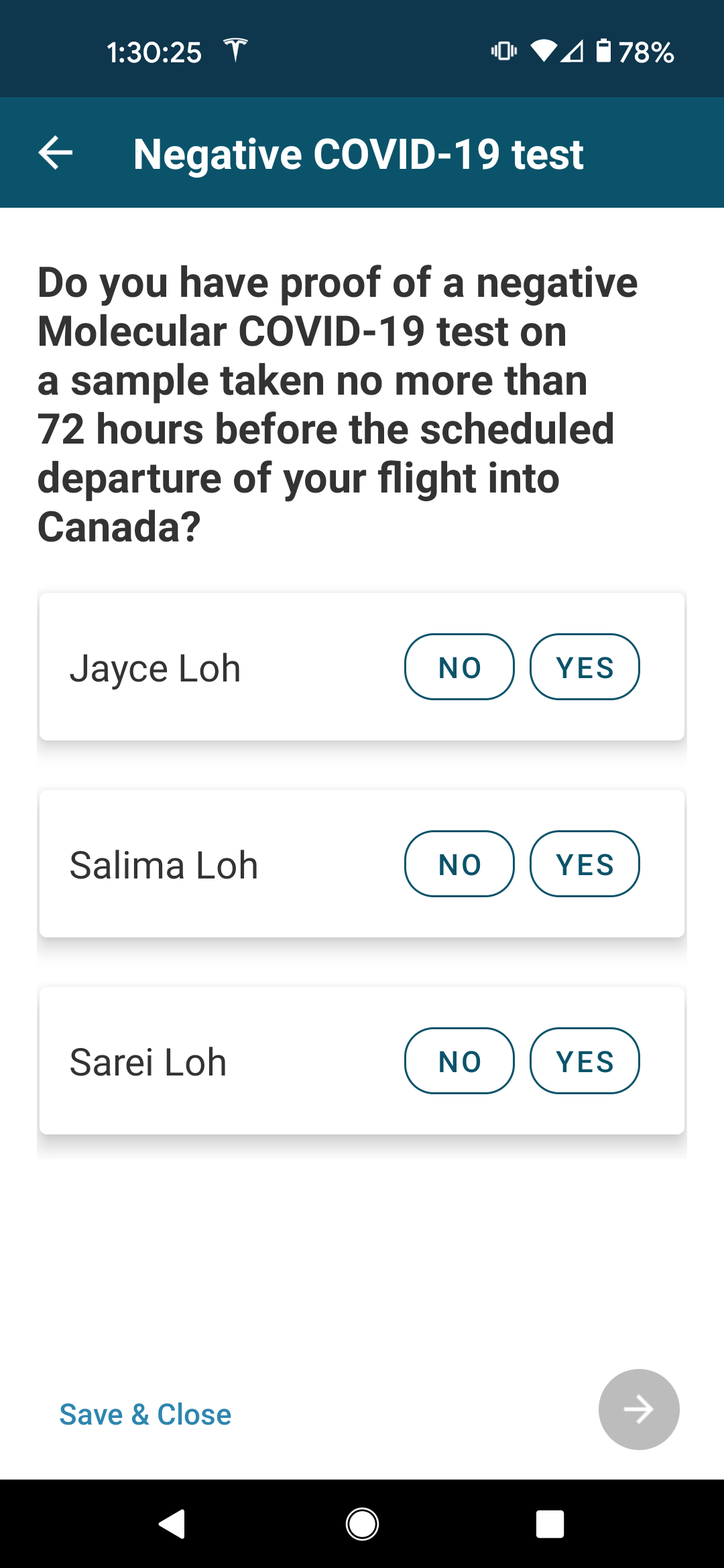 You will now be asked about whether or not you have tested positive for COVID-19 between 14 and 90 days prior to your departure to Canada, as well as whether or not you have a negative COVID test within 72 hours of your departing flight into Canada.