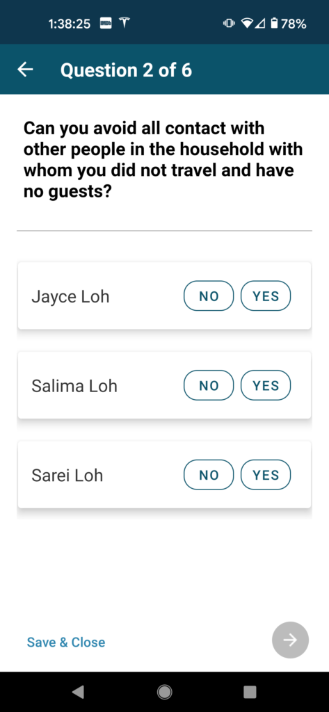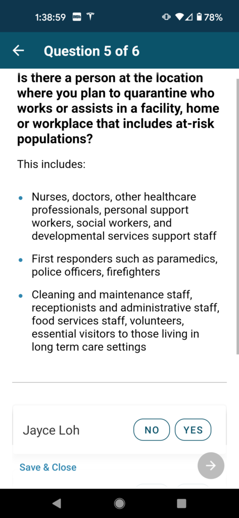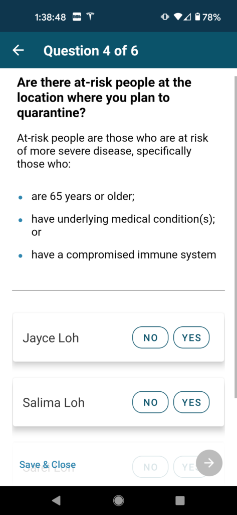 In this next phase of questions, you will be asked about your quarantine plans in the event that you are required to quarantine. This section is pretty straightforward, but it does contain a question that was a bit confusing, so follow along closely to make sure you answer correctly.