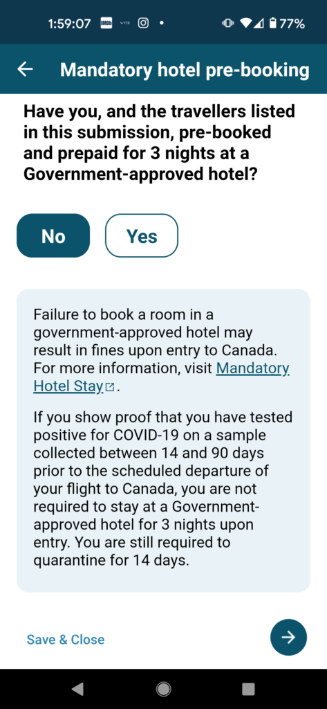 This is the question that requires a bit of thought. You are being asked whether or not you have made arrangements for a three-night stay if you do not meet travel exemptions. We had to make the assumption here that all our information was in order and that we were exempt. Thus, we answered “No” to this question.