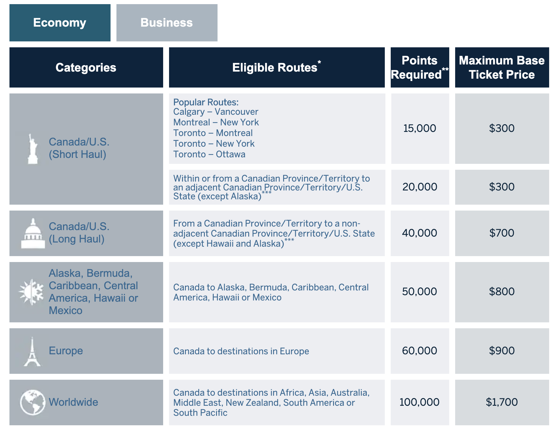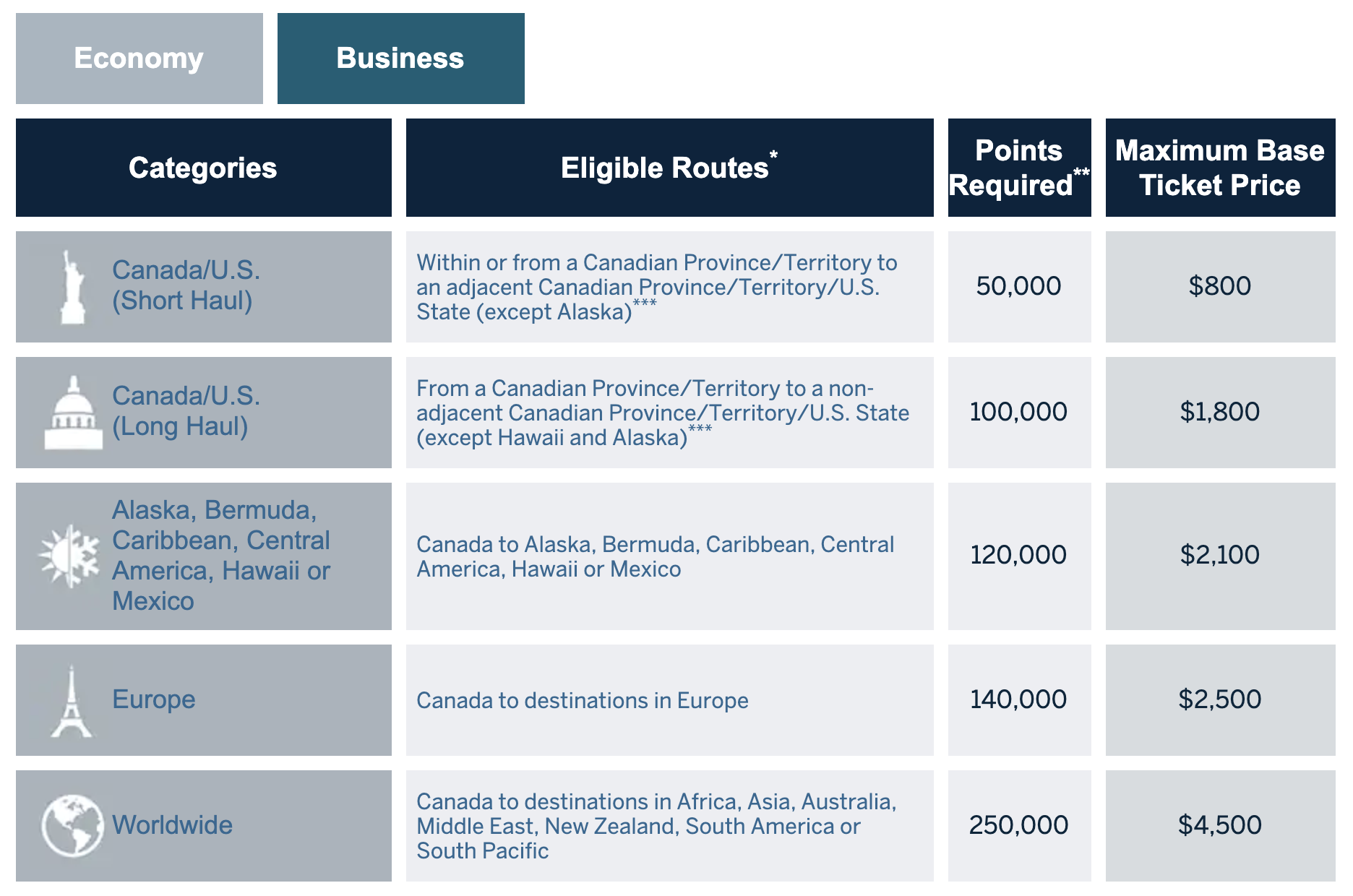 - The “Points Required” column contains two rows: the economy pricing and the business class pricing.