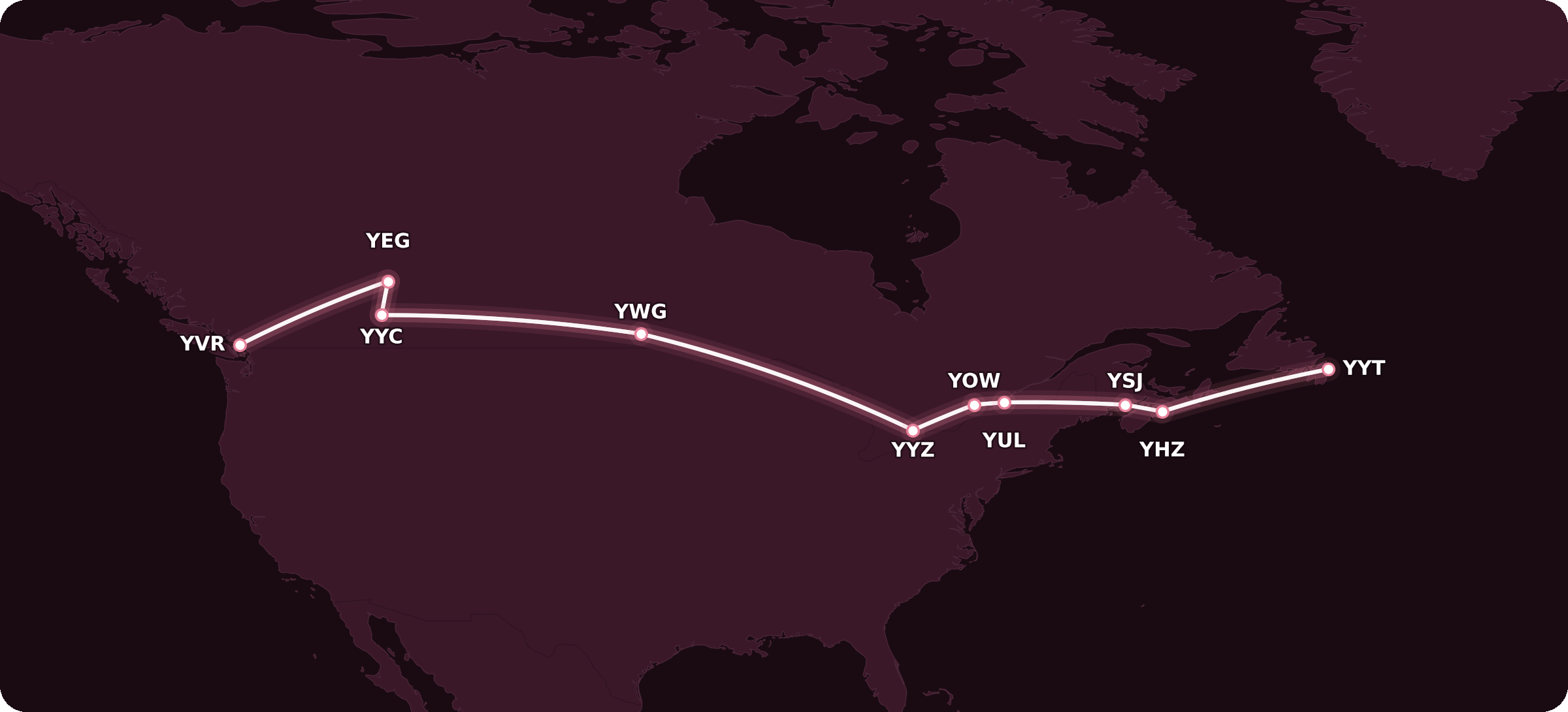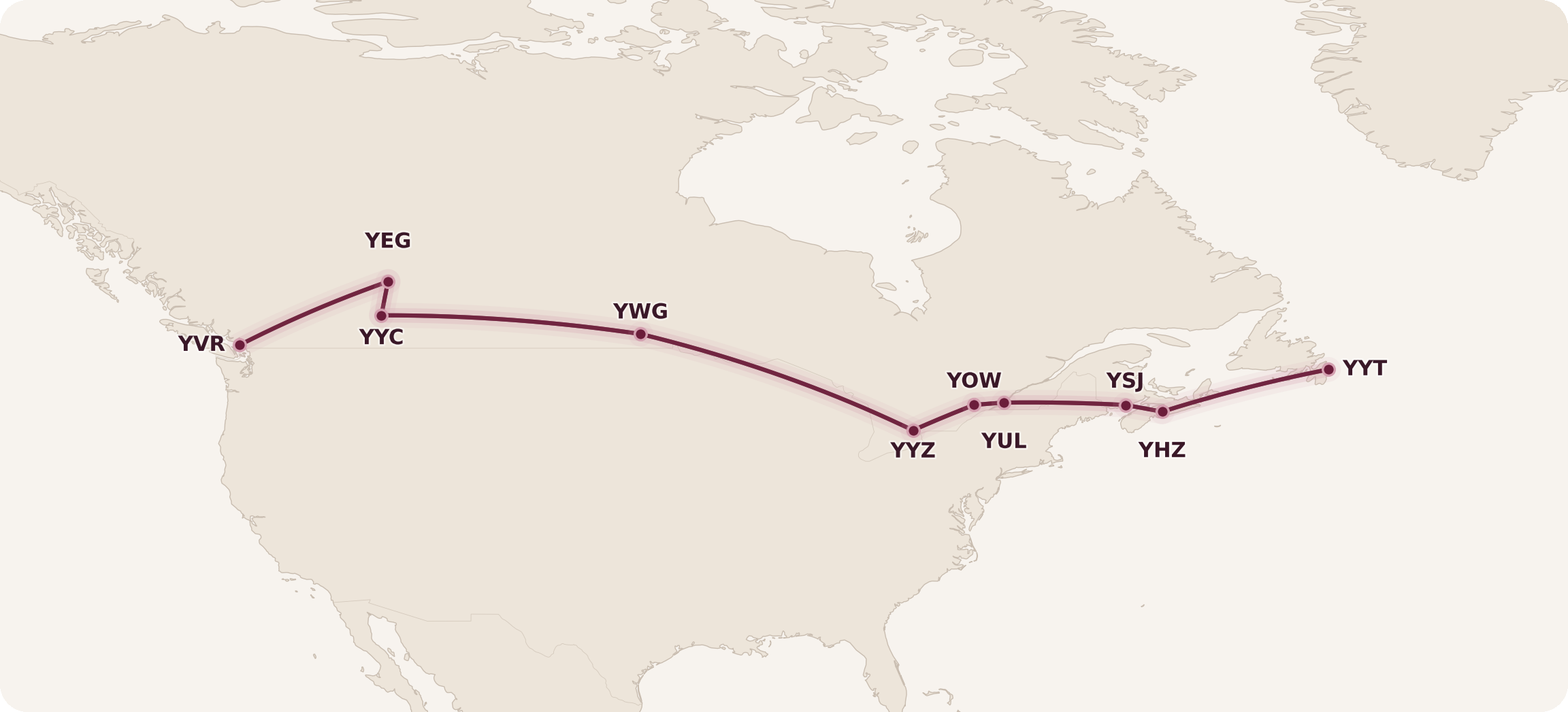 Any journey that exceeds 2,750 miles in flown distance – such as St. John’s–Vancouver, St. John’s–Calgary, Halifax–Vancouver, Halifax–Los Angeles, or Vancouver–Miami – will fall into this category.