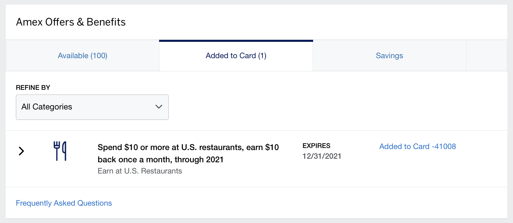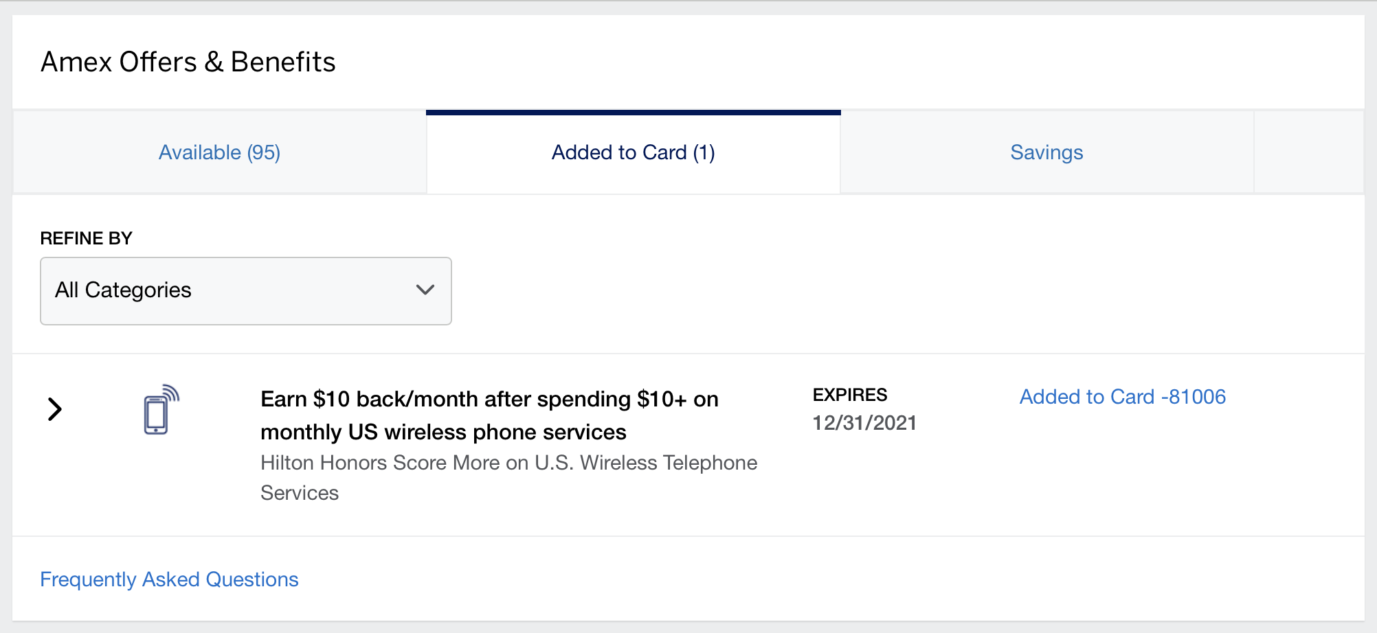 You may not see the offer immediately, because each card can only display 100 unregistered Amex Offers at a time. If this happens, try adding a few other Amex Offers to your card first, or choosing the “Featured” category of Amex Offers to get the monthly restaurant or wireless credit to show up.
