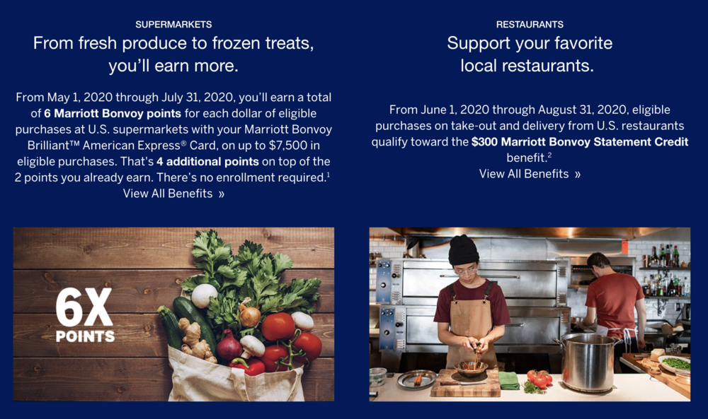 On the Amex US Bonvoy Brilliant Card and most other Marriott-branded cards issued by Amex and Chase (including the now-discontinued Amex US Bonvoy Card, but excluding the Amex US Bonvoy Business Card), you’ll now earn 6x points on up to $7,500 spent at US supermarkets through July 2020.