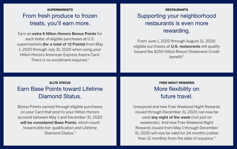 Next, the Hilton Aspire comes with a US$250 Hilton resort credit, and just like the Bonvoy Brilliant, that credit will now also cover your spending at US restaurants through August 2020.