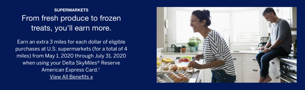 Through July 2020, the Delta Reserve Amex, Delta Platinum Amex, Delta Gold Amex, and Delta Blue Amex will all be offering 4x miles for spending at US supermarkets.