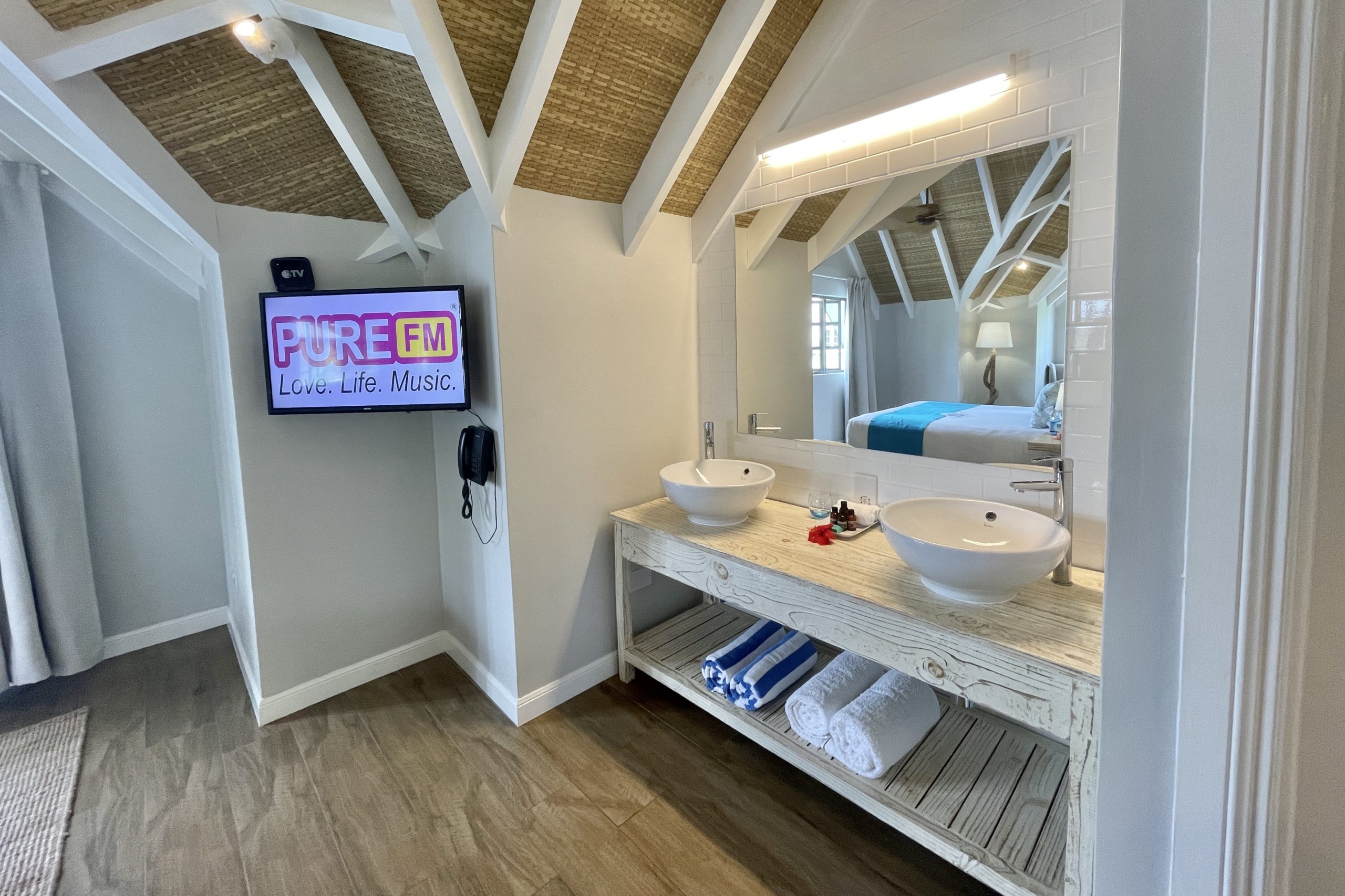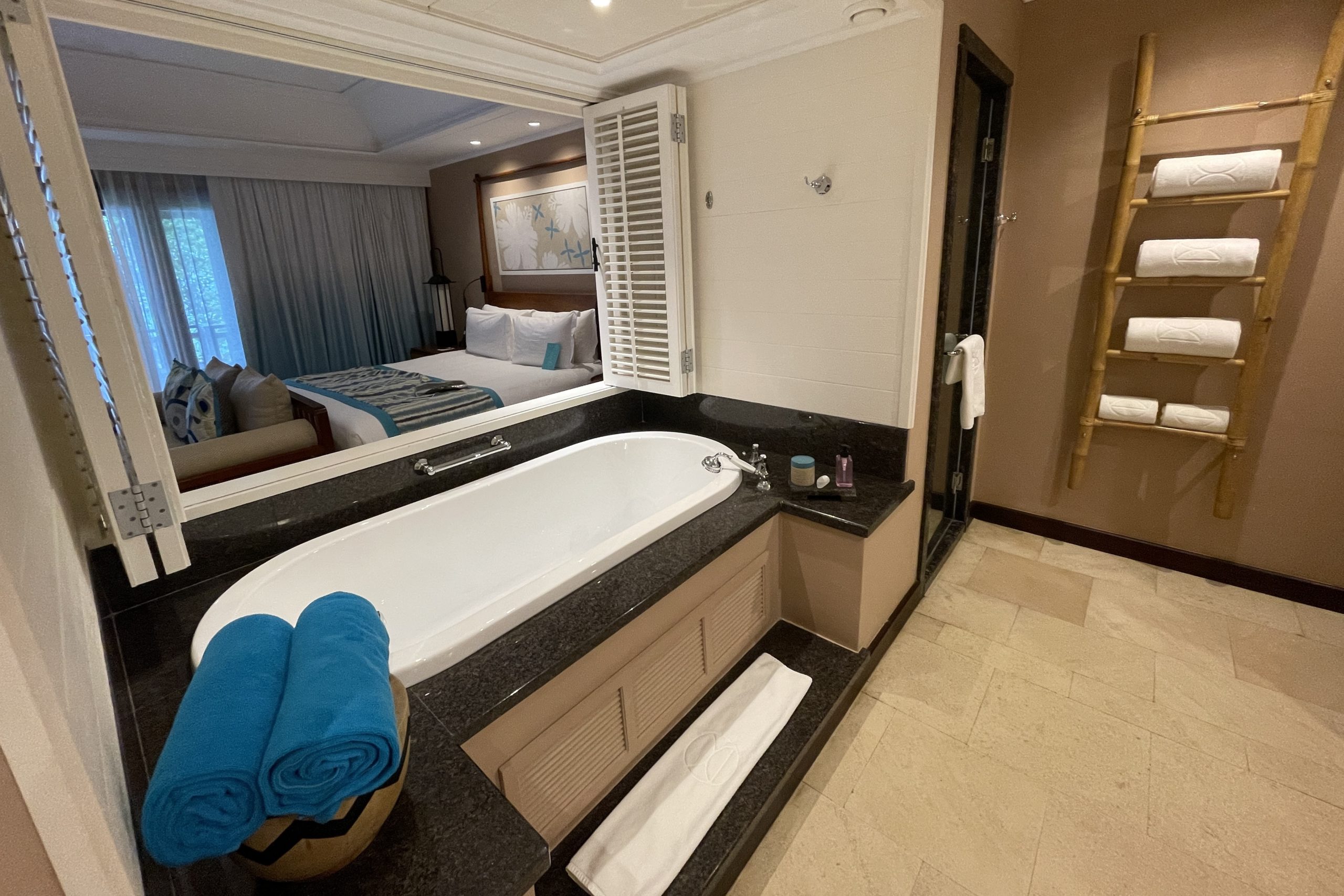 The room was air-conditioned, with a satellite TV, paid minibar, complimentary tea and coffee offerings, and a safe. The bathroom has a tub and separate shower. They also supply you with a complimentary beach bag and bottles of water that are replenished daily.