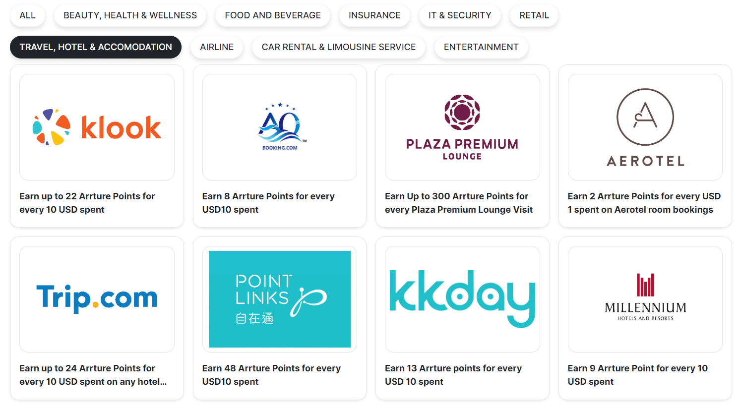 - 24 Arrture points per $10 (USD) spent on any hotel booking