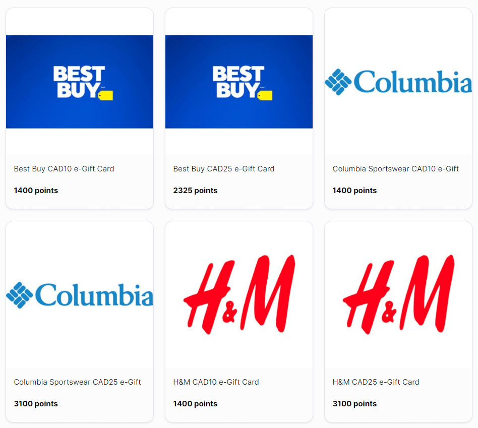 - Best Buy $25 (CAD) e-gift card: 2,325 points