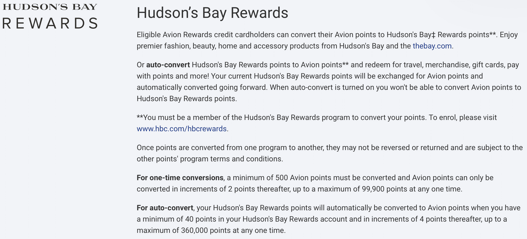 If you happen to be sitting on a large sum of Hudson’s Bay Rewards, you can actually transfer them into RBC Avion points, albeit at a fairly unfavourable ratio of 4:1. The minimum transfer amount is 40 Hudson’s Bay Rewards.