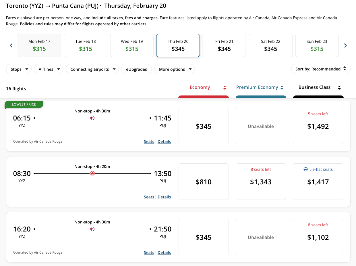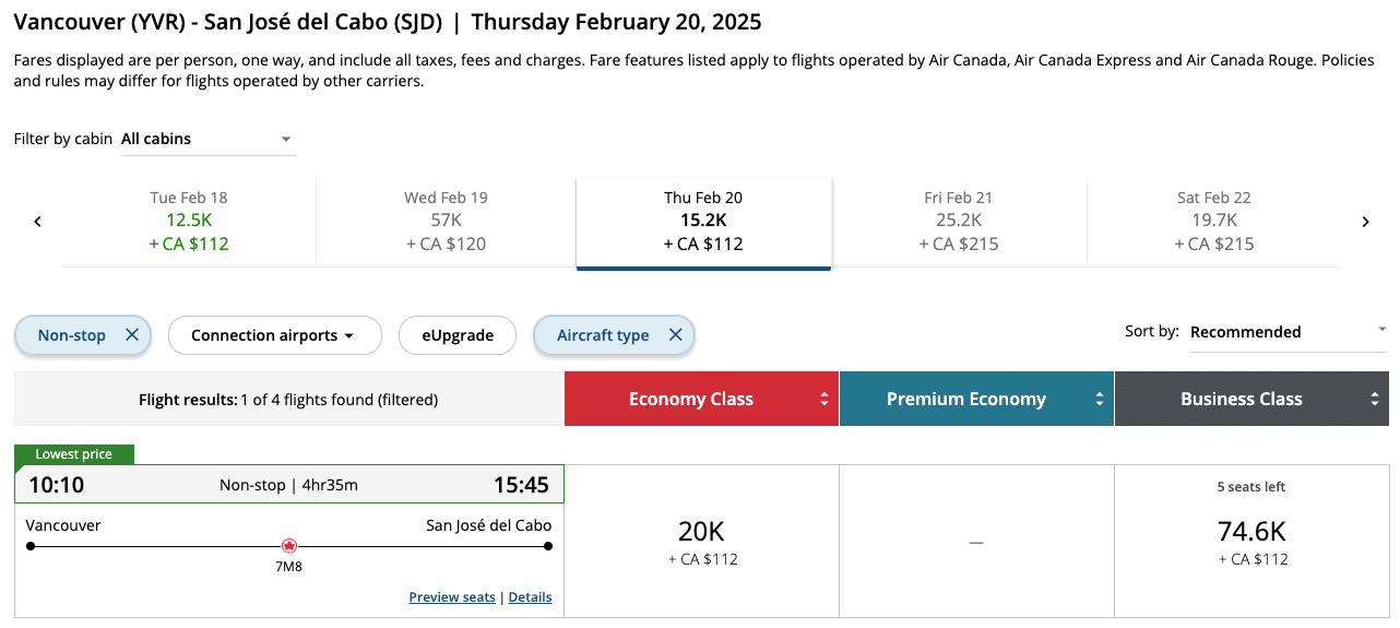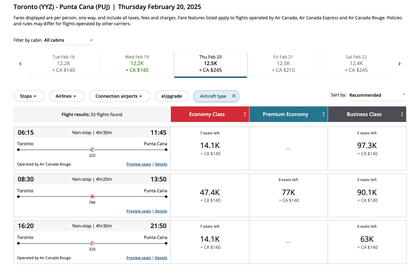 For instance, running a sample search of Toronto to Punta Cana gives us redemption options of 14,100 Aeroplan points on Air Canada Rouge flights in economy, and 47,400 Aeroplan points on Air Canada mainline economy. (Note that these prices will fluctuate depending on the departure date and availability of the seats.)