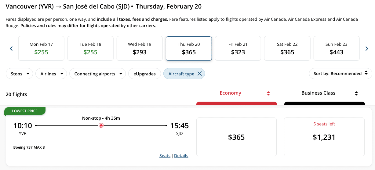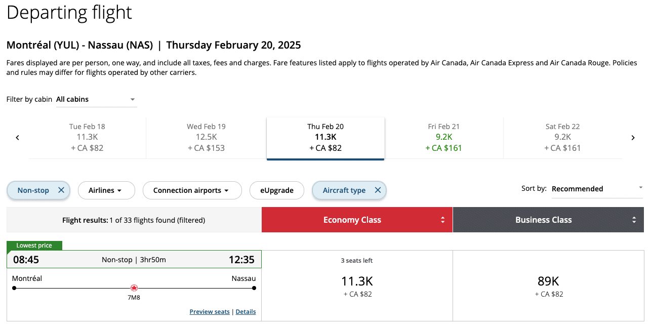 The cash fare for this flight is $345, which means the redemption value is a solid 1.45 cents per point. While this is still below our valuation of 2.1 cents per Aeroplan point, it’s not a bad way to redeem if you’re looking for a winter escape.