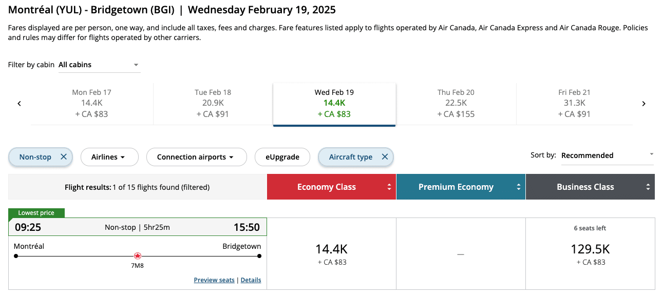 Flights from Montreal (YUL) to Bridgetown (BGI) provide an excellent opportunity to redeem your Aeroplan points. As a redemption example, you could book a one-way, direct economy flight for just 14,400 Aeroplan points and $83 in taxes and fees.
