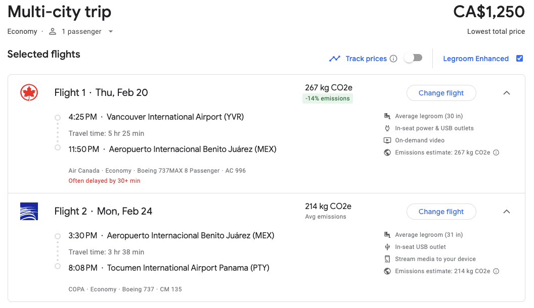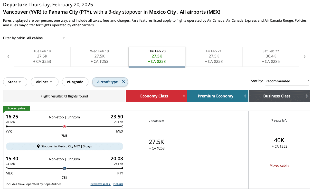 As an example, using Aeroplan’s stopover feature, which allows you to enjoy an extended stay in a connecting city on the way to your final destination, you could book a one-way economy flight from Vancouver (YUL) to Panama (PTY) with a three-day stopover in Mexico City (MEX) for just 27,500 Aeroplan points and $253 in taxes and fees.