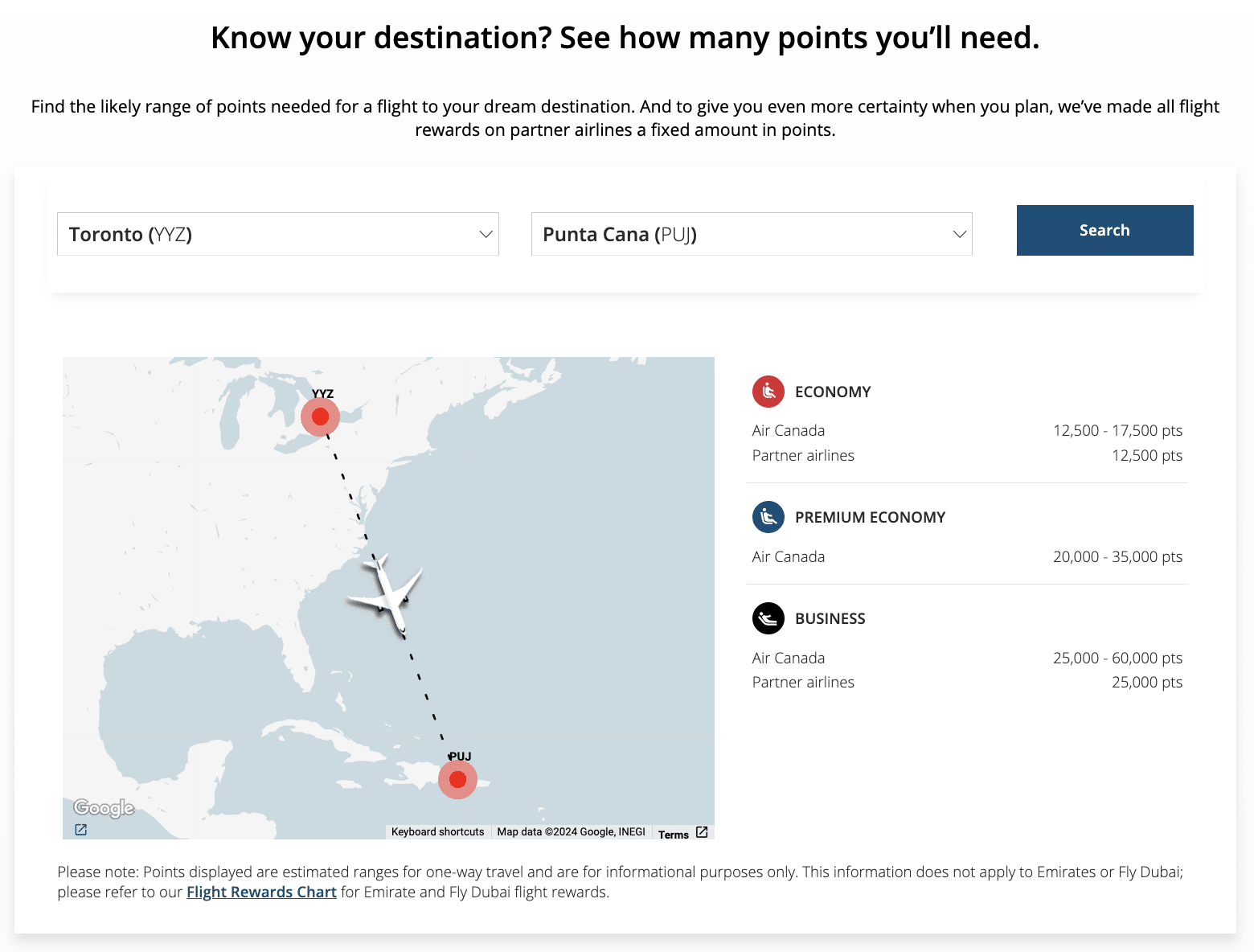 For instance, if you wanted to find out the range of points required for a flight from Toronto to Punta Cana, simply enter “Toronto (YYZ)” and “Punta Cana (PUJ)” into the tool, and it will display the point range as shown below.